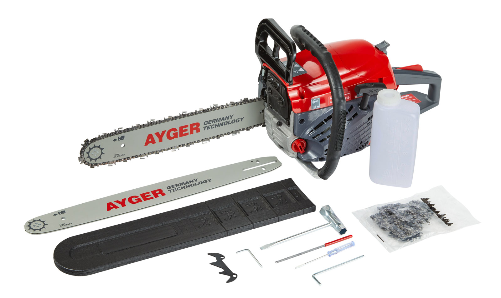 Например, цепная бензиновая пила AYGER APS430-18 – одна из наиболее популярных моделей любительского класса, по праву, считается лучшим инструментом для длительной работы на стройке и саду. На представленной пиле установлена пильная гарнитура шагом цепи 325 мм, число оборотов в минуту – 3000, объем топливного бака – 260 м, объем масляного бака – 550 мл.